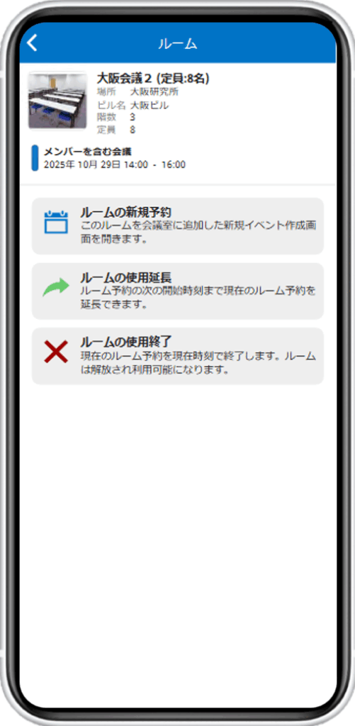 先にできる機能をご紹介すると「新規予約」「使用延長」「使用終了」の3つです。これらって今の会議予約に対して三大操作したいことだと考えました(他にあればご連絡ください。実装考えます)。