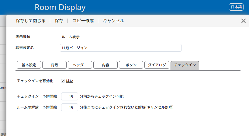 時間設定は管理センターの表示端末設定(テンプレート)の「チェックイン」タブで行います。